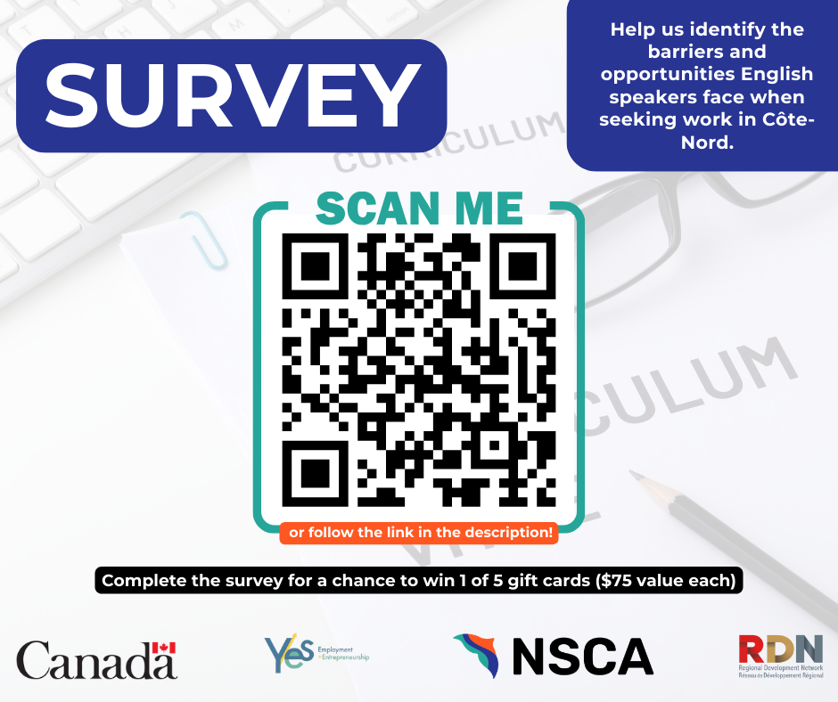 News Employability Survey March 9, 2026 News & Podcasts News Employability Survey Are you an English speaker living in the Côte-Nord? We want to hear from you! Complete our Employability survey for the chance to win one of five gas or grocery cards valued at $75 each! Presented by the North Shore Community Association (NSCA) in collaboration with the Regional Development Network (RDN), this survey aims to identify barriers and opportunities English speakers face when seeking employment and accessing employment services in Côte-Nord. Scan the QR code above or follow this link to complete the survey: https://www.surveymonkey.com/r/PFSNZWY We appreciate your input and invite you share this important survey with English speakers in your networks! Share This Article Facebook Twitter LinkedIn Pinterest Email