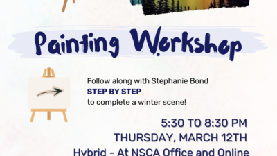 Winter Painting workshop 12 March 2026 / Registration Closed Published: October 31, 2025 Events Winter Painting workshop Paint Night 2.0 is here! Join us on Thursday, March 12th from 5:30–8:30 PM for a cozy and creative evening with special guest Stephanie Bond! NSCA will provide all painting materials and light snacks for those attending in person at our offices in Baie-Comeau & Sept-Îles. You’re welcome to bring your own brushes if you’d like Spots are limited — please register by March 6th!